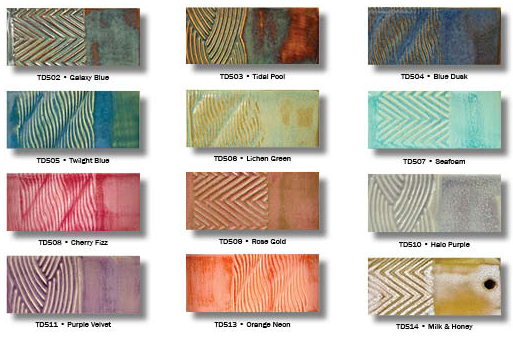 Our TIE-DYE glazes have remarkable versatility when using various thick and thin applications. Like our sculptural glazes, they are reactive and interactive with each other and with your clay body. Texture brings out the best in these glazes!